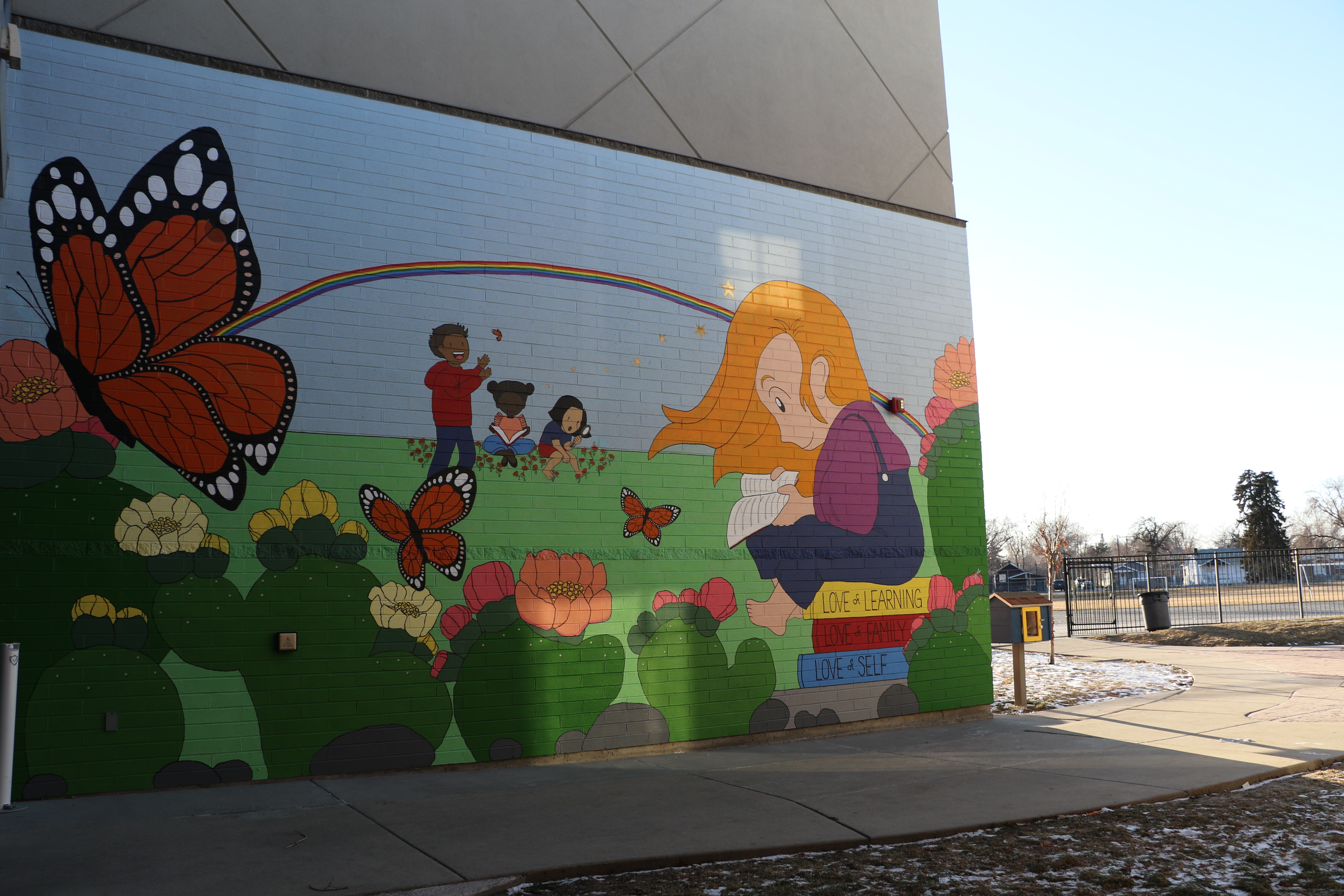 Jessica Schroeder valued curiosity and worked hard to foster a love of learning in her students, and this sentiment is captured in the imagery of the public artwork. The mural depicts her reading a book in the foreground while children explore outside in the background, surrounded by monarch butterflies, prickly pear cactuses, rainbows, and gold stars. The space is meant to help Schroeder’s students and colleagues grieve, explore their feelings, and feel peace about losing their beloved teacher. The space is also open to the public.